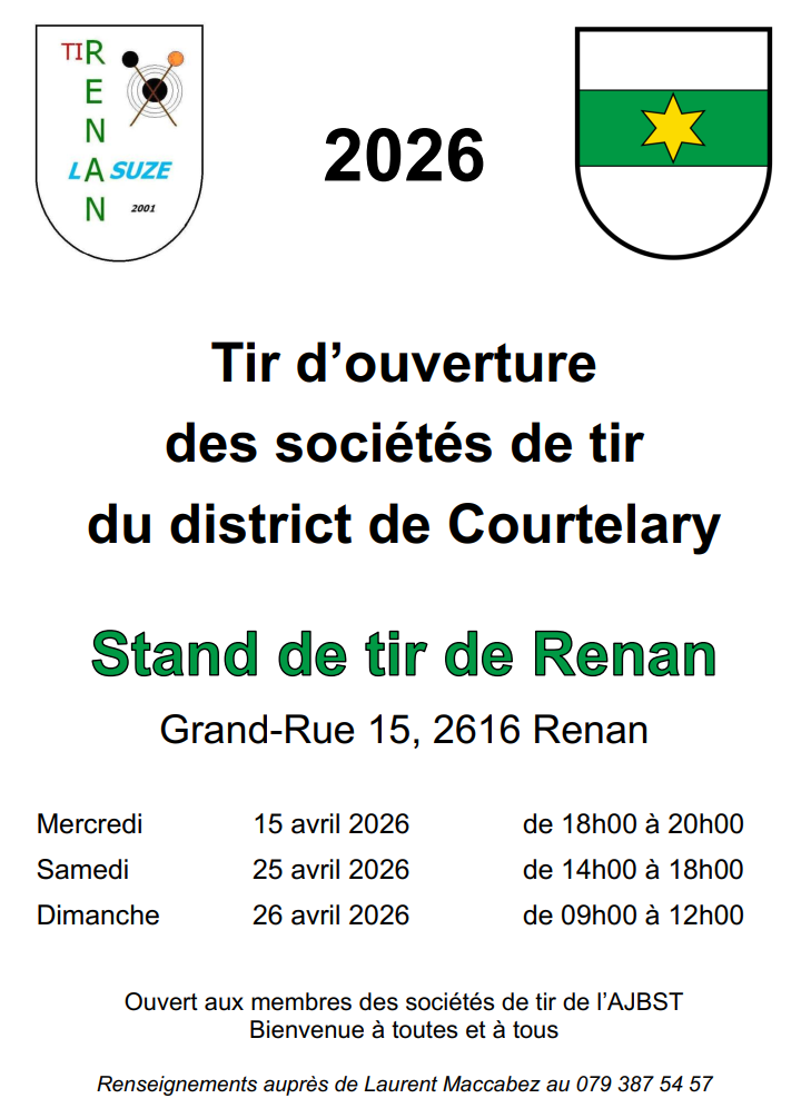 Tir d'ouverture 2026 En 2026, le tir d’ouverture du distric de Courtelary se déroule dans le stand de Renan. Voici ci-dessous les horaires de tir. Cliquer ici pour télécharger le document contenant toutes les informations.